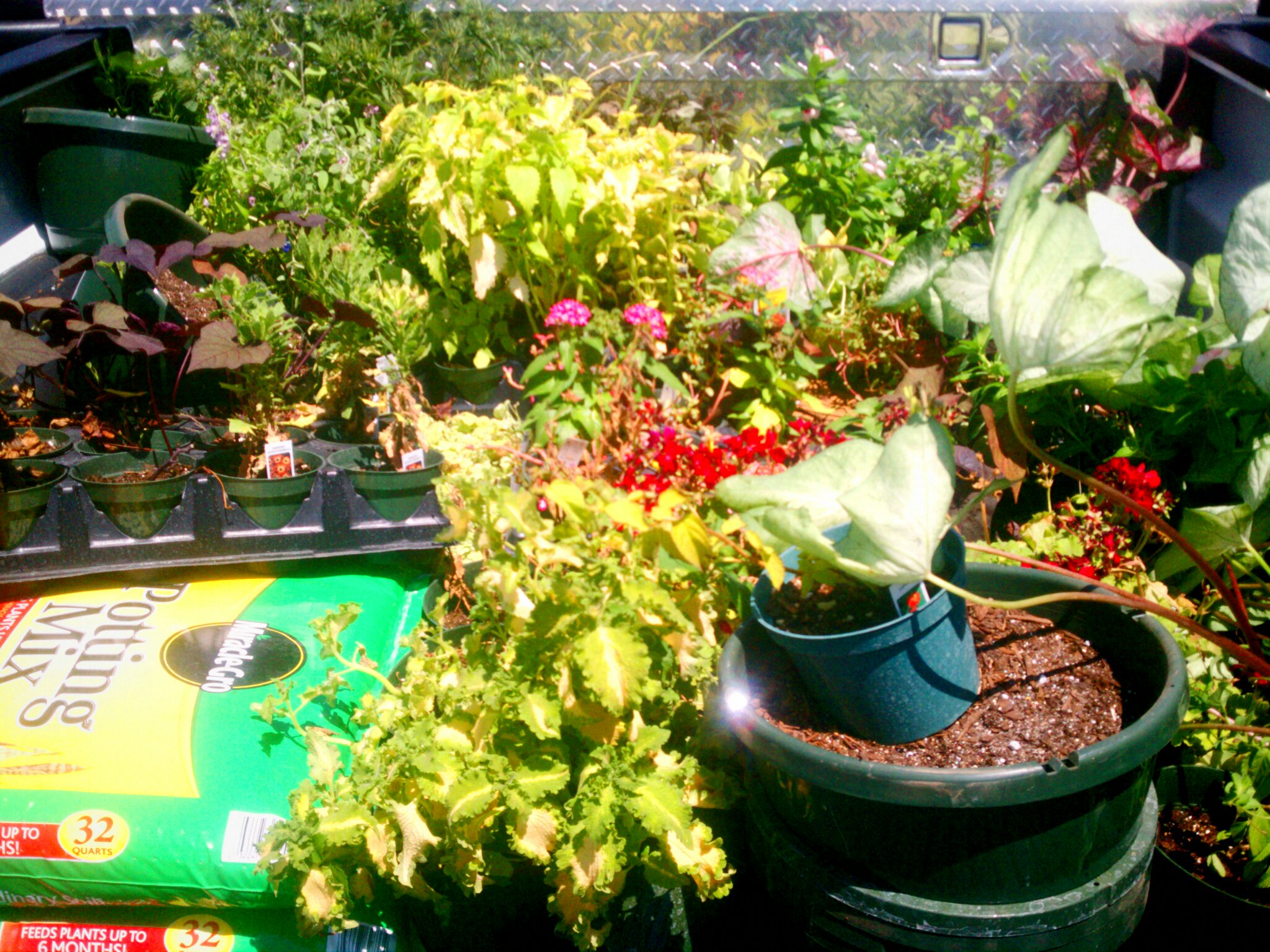 we got up around 7:00 and caffeinated ourselves. from there we went to one of her friend’s greenhouses to pick up flowers. torre’s network is making a ton of things happen for me and i would be up poo creek without a paddle if it weren’t for her. her friend had some lovely flowers that just need some water and some love (please read: BUDGET FRIENDLY!). she also had some fabulous ideas of what to do with the flower beds at my aunts. after we left there we stopped by my aunt’s office and scooped up my mama and a pick-up. we all three piled in (i got to sit in the middle, my fav!) and headed to lowe’s to round out the flower collection.
